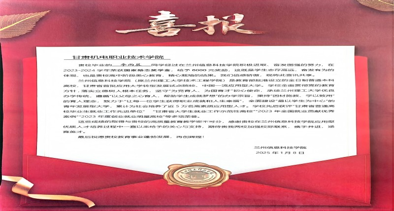 2023-2024学年国家励志奖学金名单中,来自兰州信息科技学院本科院校的李雨晨格外引人注目——她曾是我校经济管理学院大数据与会计专科专业(JG2032班)的优秀学子,通过专升本实现学历跃升,并在本科阶段以优异成绩斩获国家荣誉。她的故事证明:专科生的求学之路没有天花板,只要敢于突破,梦想终会照进现实。