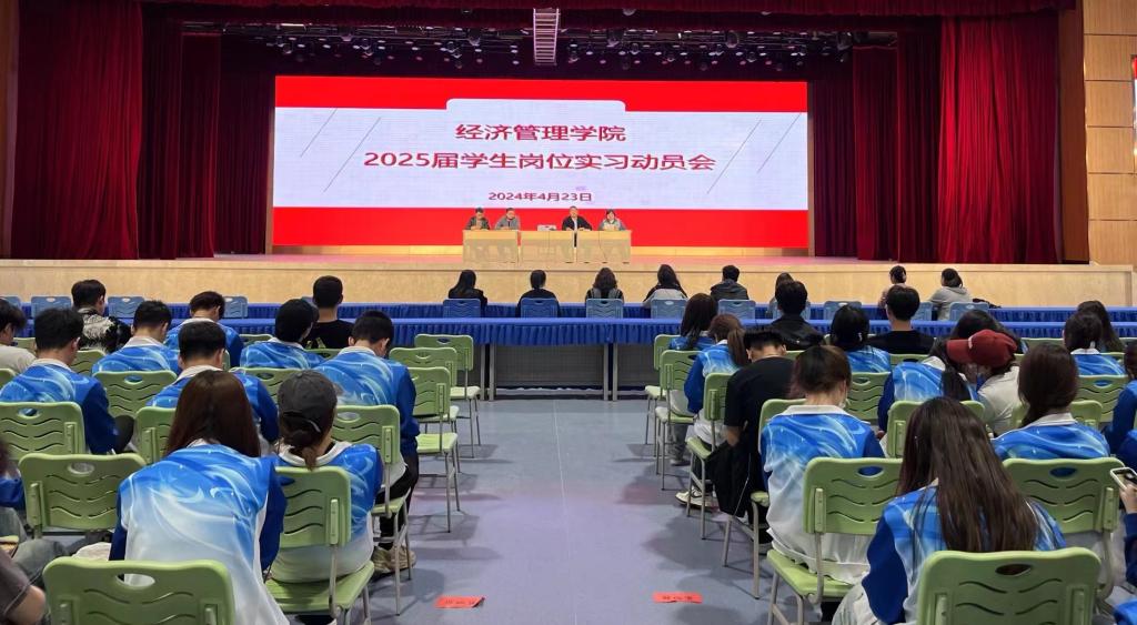 4月23日下午,经济管理学院召开在学校大学生活动中心举行2025届毕业生岗位实习动员大会。经济管理学院党总支副书记王玥,副院长张正旭、李金龙,学生管理干事及2025届全体辅导员、学生代表共300余人参加动员会。会议由经济管理学院党总支副书记王玥主持。