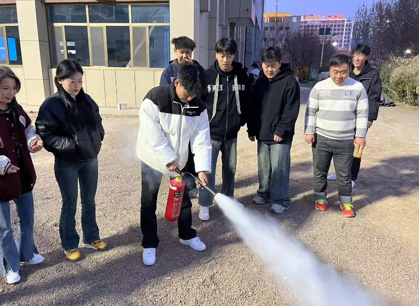 实训室管理员现场讲解了灭火器及其他消防器材的操作规范。随后组织参加演练的学生分组实际操作演练。