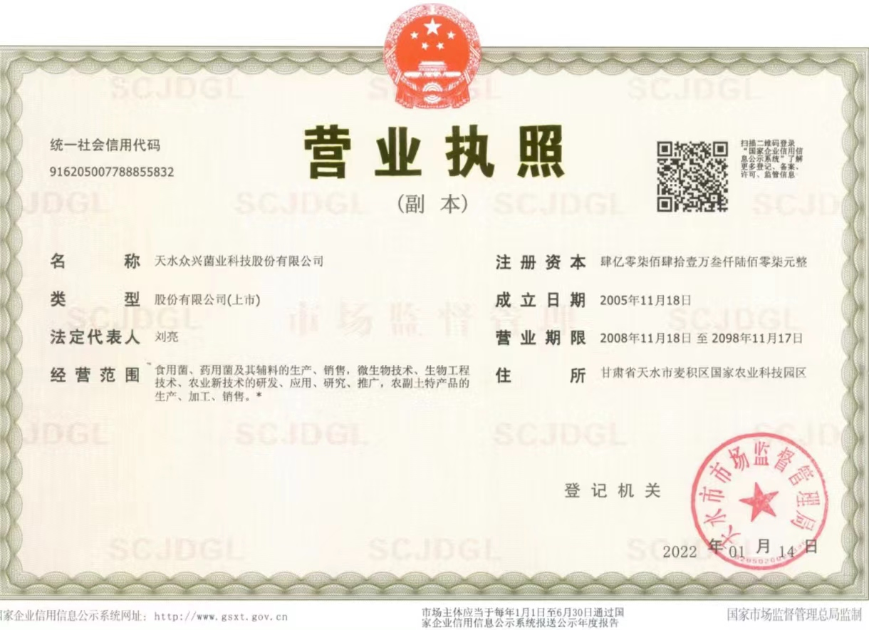 天水众兴菌业科技股份有限公司的前身天水众兴菌业有限责任公司成立于2005年11月,是一家致力于食用菌研发、生产以及销售的国家级农业产业化重点龙头企业。2015年6月26日在深圳证券交易所挂牌上市,股票代码002772,是天水市首家上市的农业企业。公司总部位于天水国家农业科技园区,目前在陕西杨凌、山东德州、江苏徐州、四川眉山、河南新乡、河南安阳、吉林省吉林市、甘肃武威、安徽定远、湖北云梦、安徽五河等地建有15个全资及控股子公司,在四川德阳和德国托尔高拥有2个参股公司。