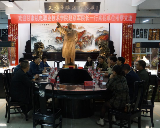 天水飞天雕漆工艺家俱有限责任公司董事长张晓彤、总经理朱良军分别介绍了天水飞天雕漆工艺家俱有限责任公司的基本情况、主要产品、发展战略,并指出校企合作是学校发展的需要,也是企业发展的需要,在合作过程中,将加强与学院的沟通协调,充分发挥企业的资源优势和市场优势,为当地非遗文化发展和非遗产品推广助力。