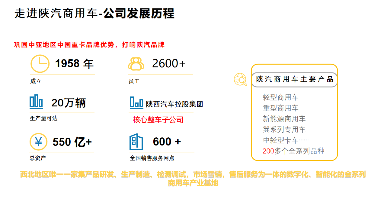 陕汽集团商用车有限公司是陕西汽车控股集团有限公司核心整车子公司,始建于1958年,是西北地区集产品研发、生产制造、检测调试、市场营销、售后服务为一体的数字化、智能化的全系列商用车产业基地,企业的发展承载着国家加快建设汽车强国的殷切期盼。公司产品覆盖重、中、轻型商用车、专用车及新能源汽车等200余款车型,在轻量化、经济性、新能源及智能网联等领域具有行业领先的技术能力和研发优势。公司在全国拥有600多个销售服务网点,用户覆盖31个省,市,自治区和直辖市,并陆续在非洲、南美洲、东南亚、中亚等地区实现整车出口。2019年4月28日,陕汽商用车被国务院国有企业改革领导小组正式列入“双百企业”名单,成为第47家新增的双百企业,