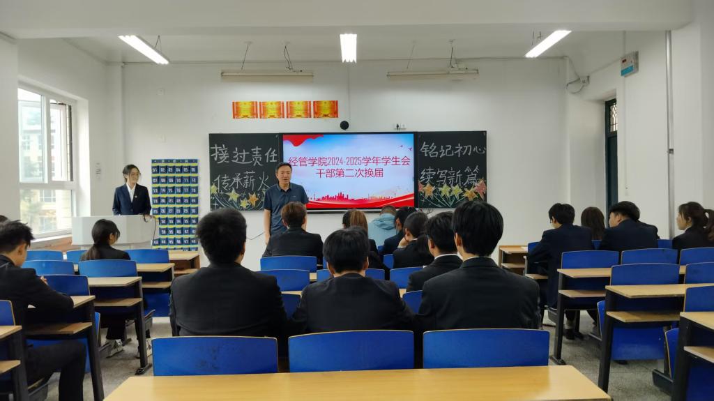 2025年5月24日下午在二号教学楼205举行“经管学院学生会换届大会”,经管学院党总支副书记卢继恩、学生会负责人王永刚及23、24级全体学生会干部参加。
