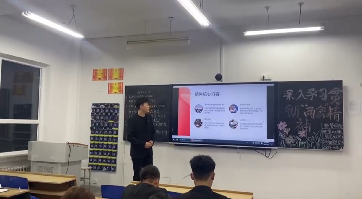 在团课现场,李文涛同学以饱满的热情和清晰的逻辑,向同学们详细介绍了全国两会的基本情况、重要议程以及会议期间提出的一系列新政策、新举措。他特别强调了这些政策与同学们学习、生活以及未来发展的紧密联系,如创新创业政策的优化、教育改革的深化以及就业市场的拓展等,激发了同学们浓厚的兴趣和强烈的共鸣。