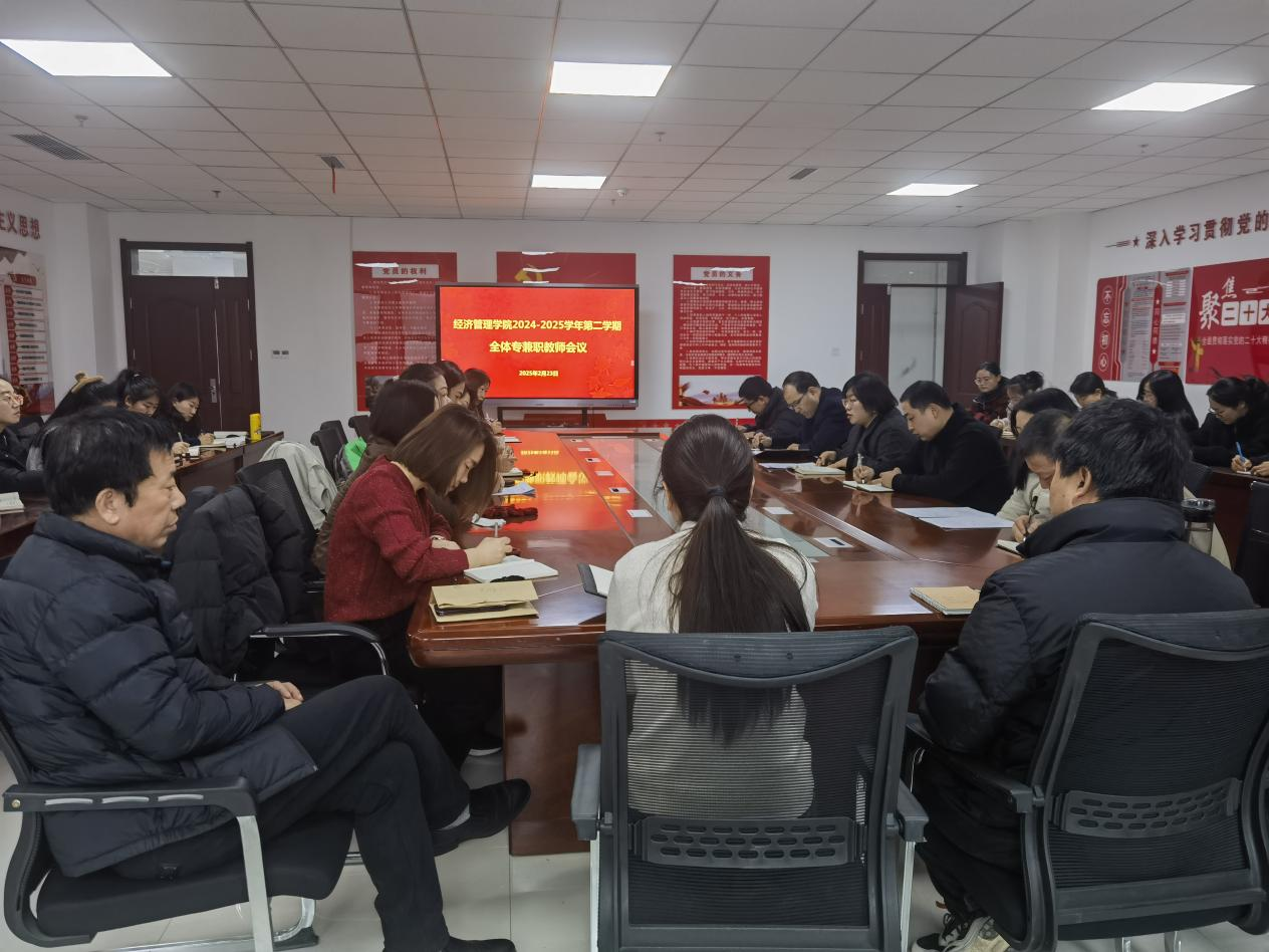 为统筹推进新学期教学工作,深化教育教学改革创新,2025年2月23日上午,经济管理学院在明德楼A901会议室组织召开2024-2025学年第二学期全体专兼职教师会议。学院党总支书记谢宏斌,院长王玥,副院长李金龙,副书记赵红红及全体专兼职教师参加会议,会议由王玥主持。