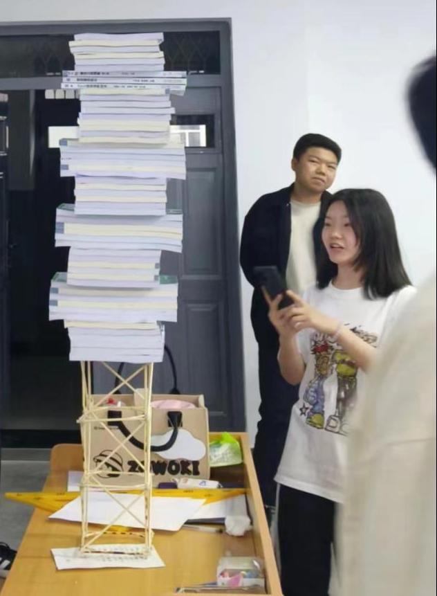 本次模拟赛参赛选手共38人,分为13组每组3人参加比赛。每个参赛小组根据设计理念完成设计草图,按照2024年全国大学生结构设计大赛要求,制作塔式结构,并做竖向载荷试验。通过对理论方案设计情况、美观情况、材料用量、连接方式设计、承重数量等方面的指标对各组进行打分,决定冠军团队归属。比赛过程中该专业学生全员参与,反响热烈。